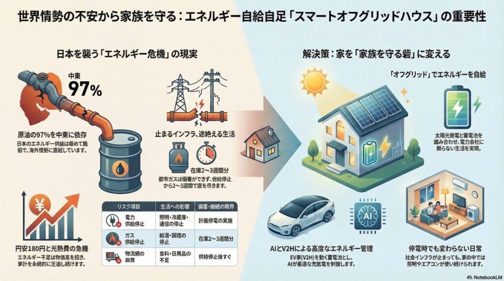 2026年以降に本当に必要なのは、社会インフラが揺らいでも、家族の生活を自宅で維持できる“自立型住宅”です。私はそれを、明工建設のスマートオフグリッドハウスとして提案しています。