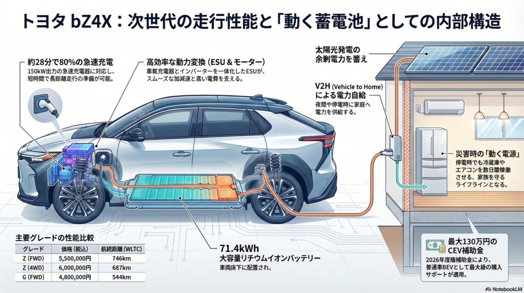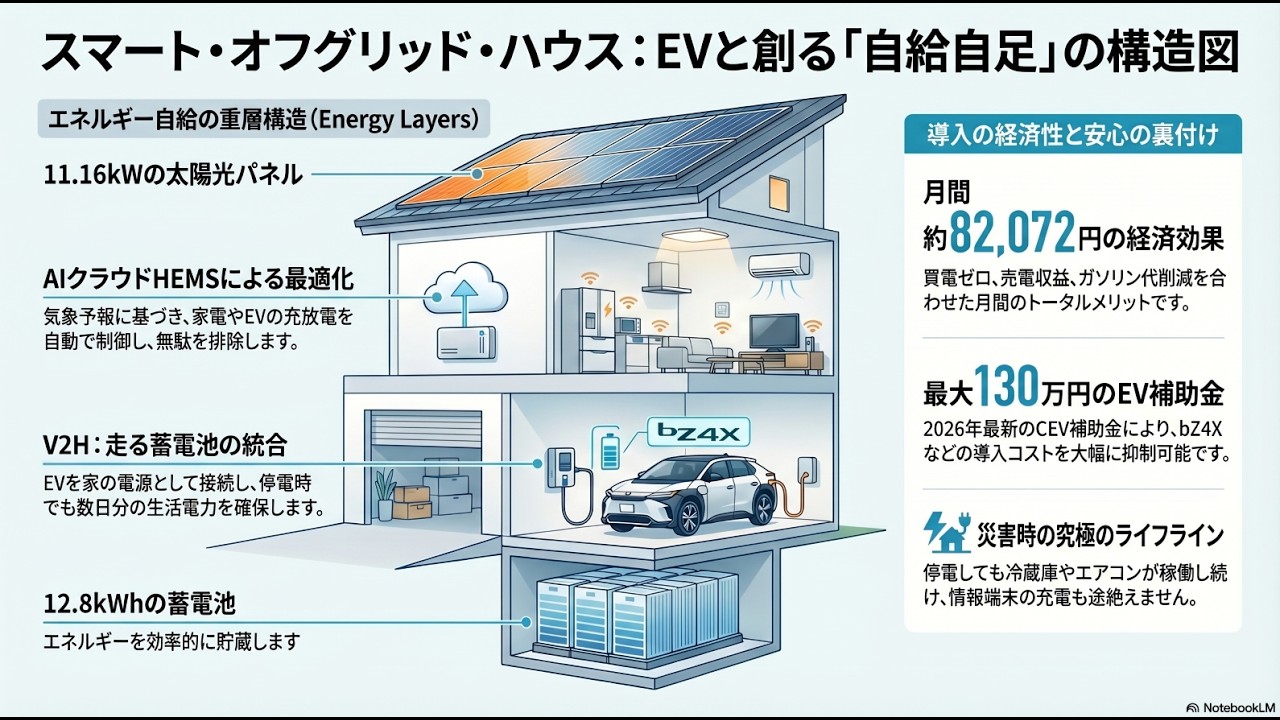bZ4XのようなBEVを、太陽光・蓄電池・V2Hと組み合わせたスマートハウスの中で考えると、車単体では見えなかった経済効果が見えてきます。