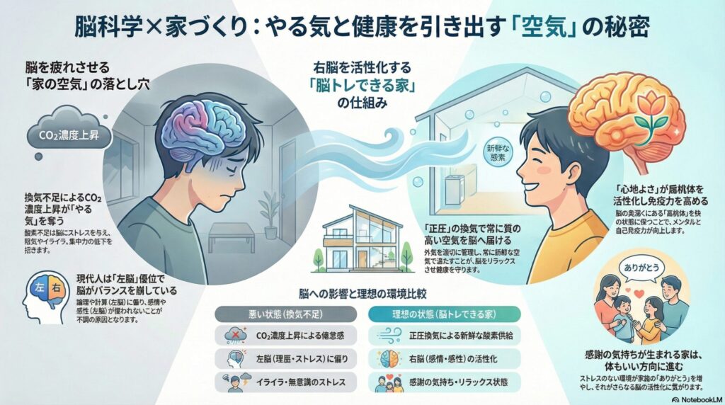 今日は、脳の専門家の知見も踏まえながら、なぜ家の空気が脳に影響するのか、そして明工建設がなぜ「深呼吸する家」「正圧の家」にこだわるのかを、仁藤流で本音でお話しします。