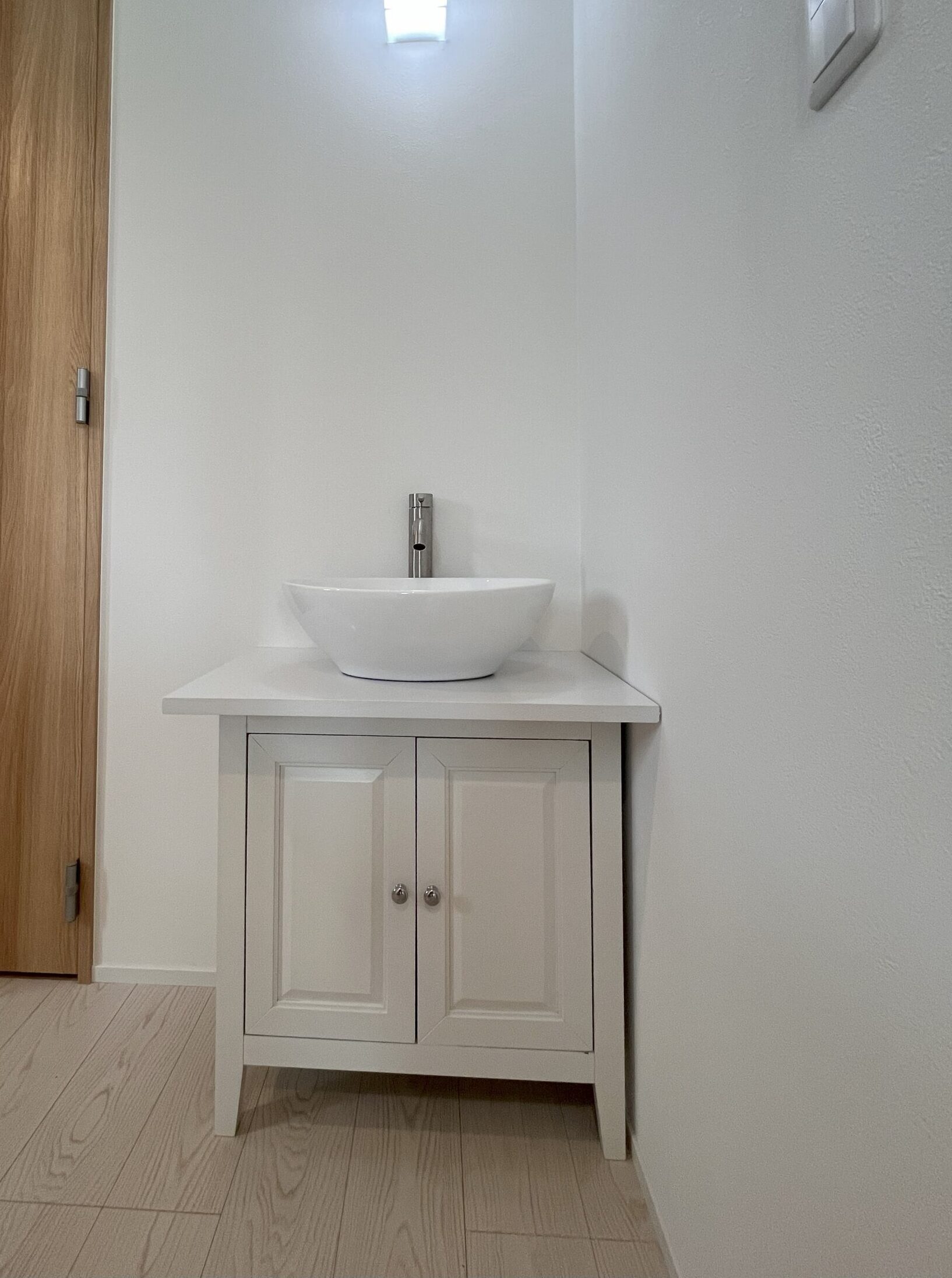 白でまとめた洗面コーナーは、清潔感と可愛らしさを両立。