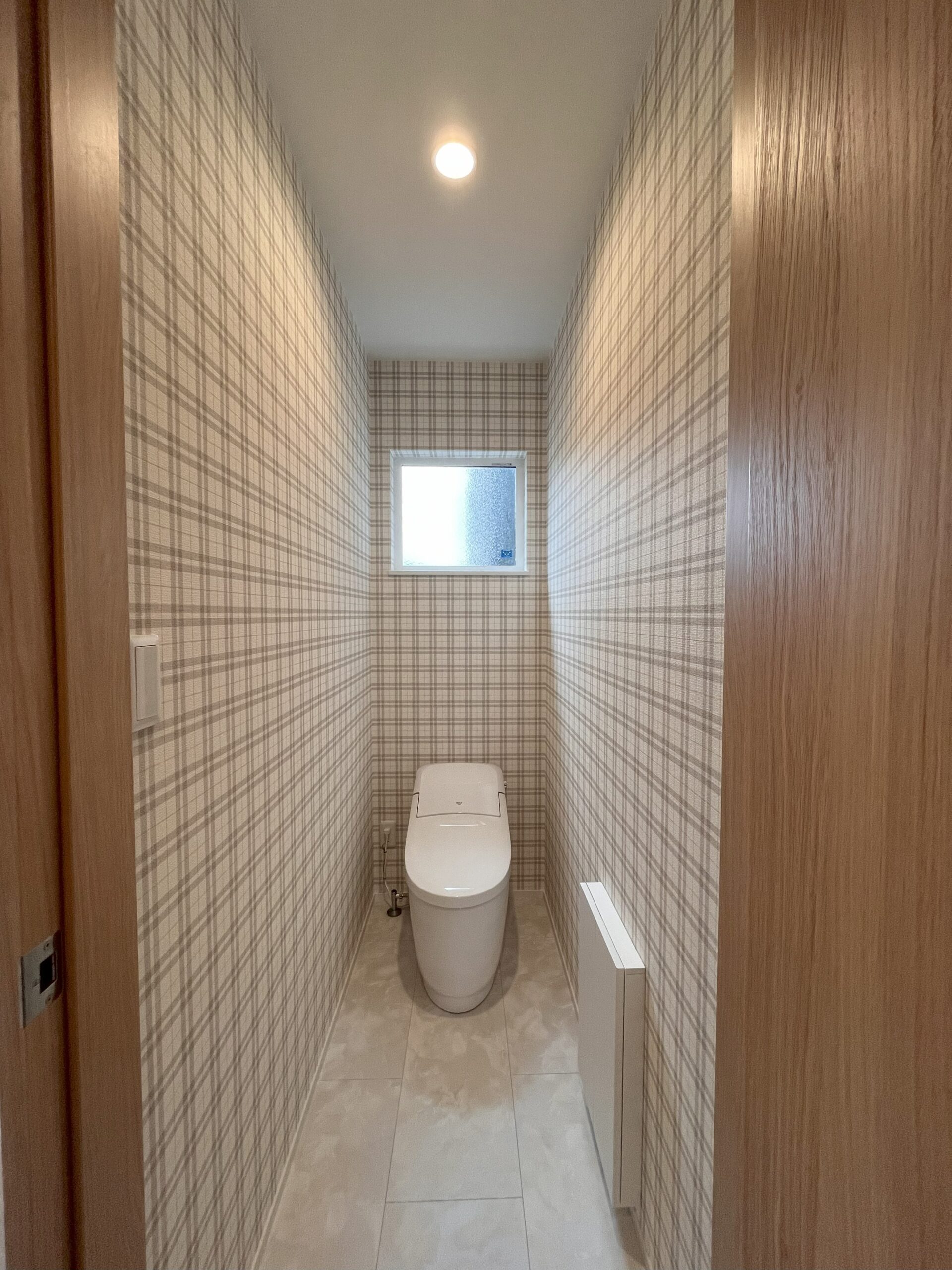 チェック柄のクロスが印象的。北欧テイストの落ち着いた空間。