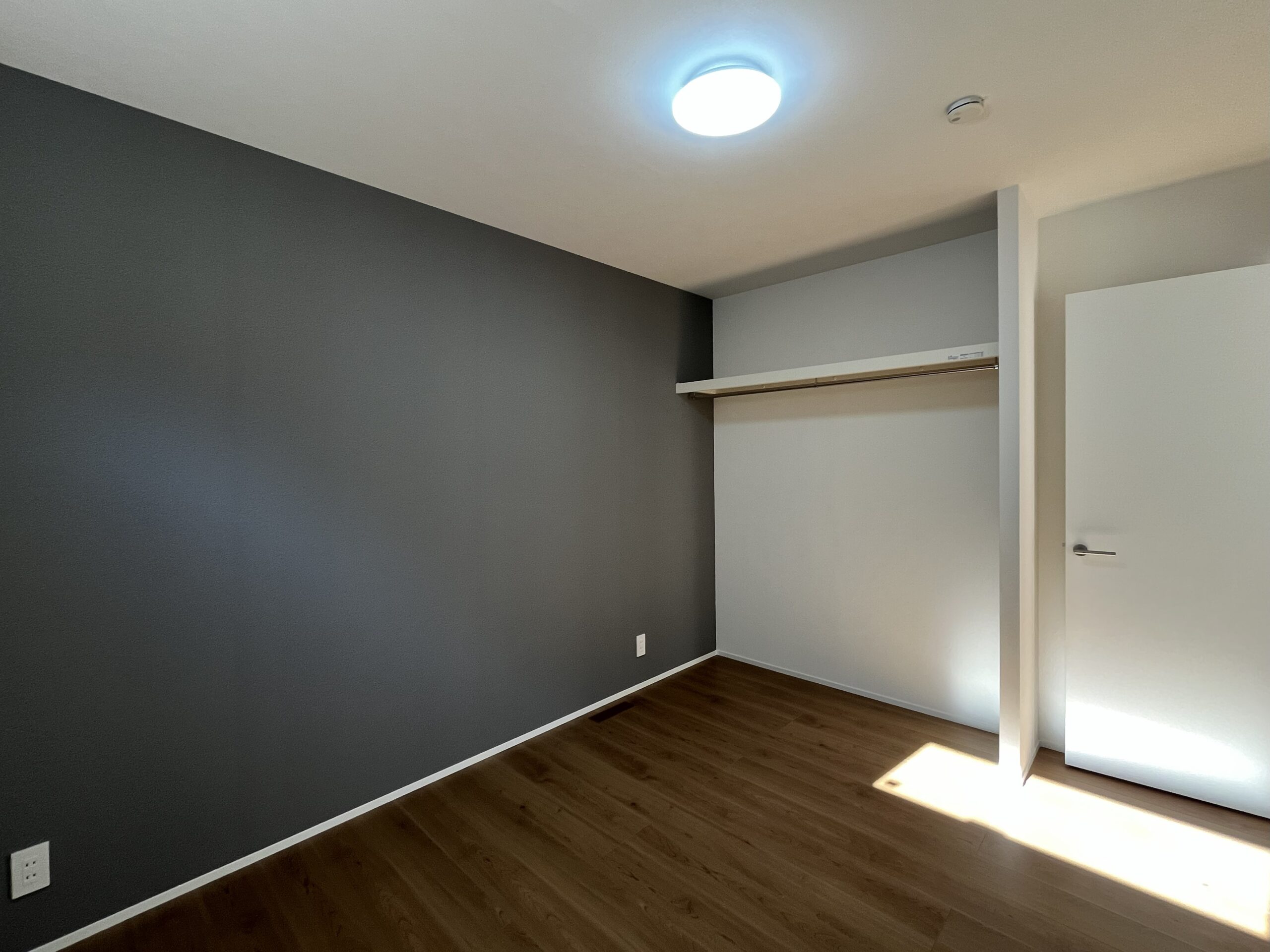 グレーのアクセントウォールが印象的な洋室。静かな時間を過ごせる、心安らぐ一室。