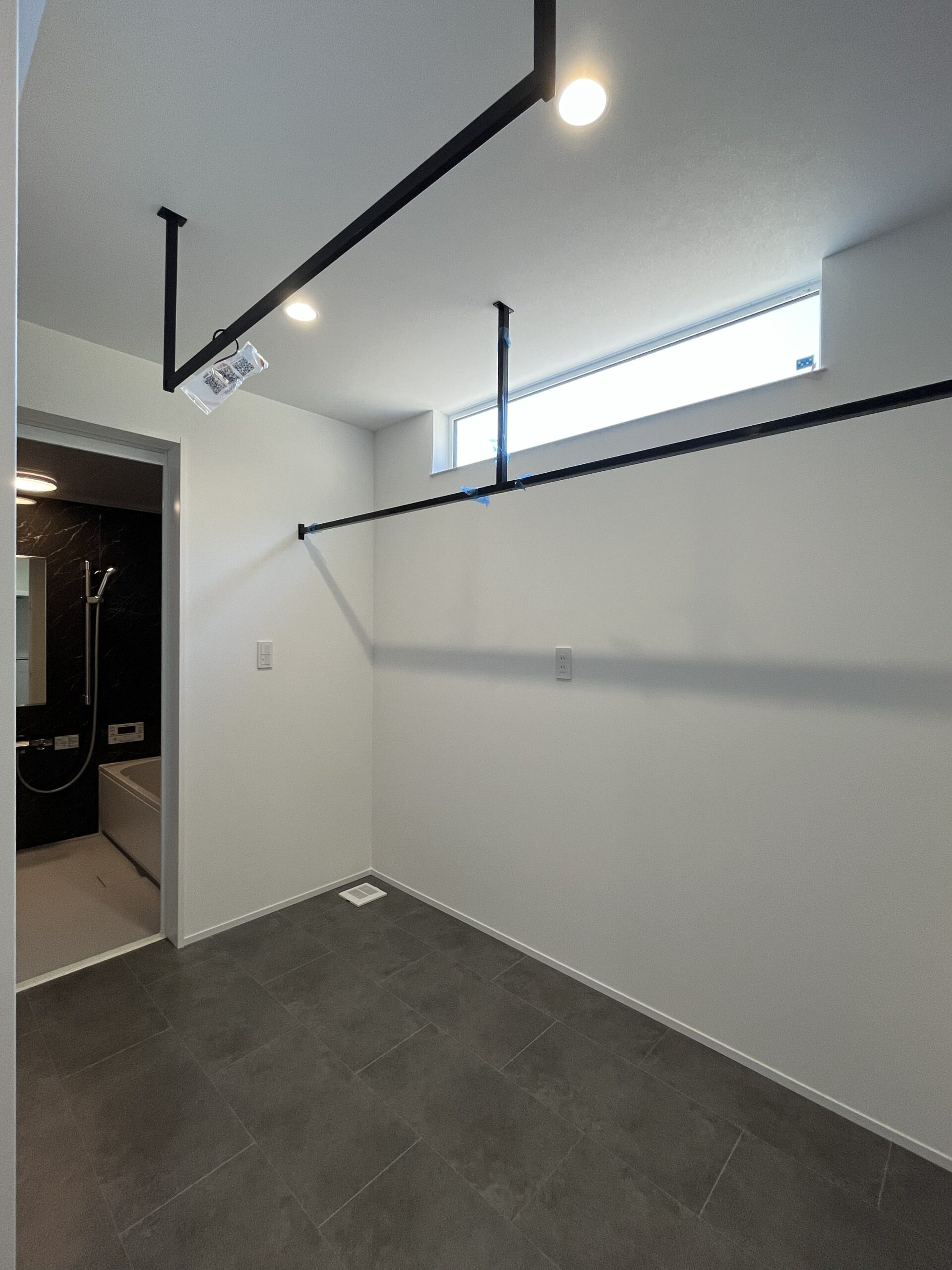 窓から光が差し込む明るいランドリールーム。室内干し金物付きで、天候を気にせず洗濯可能。