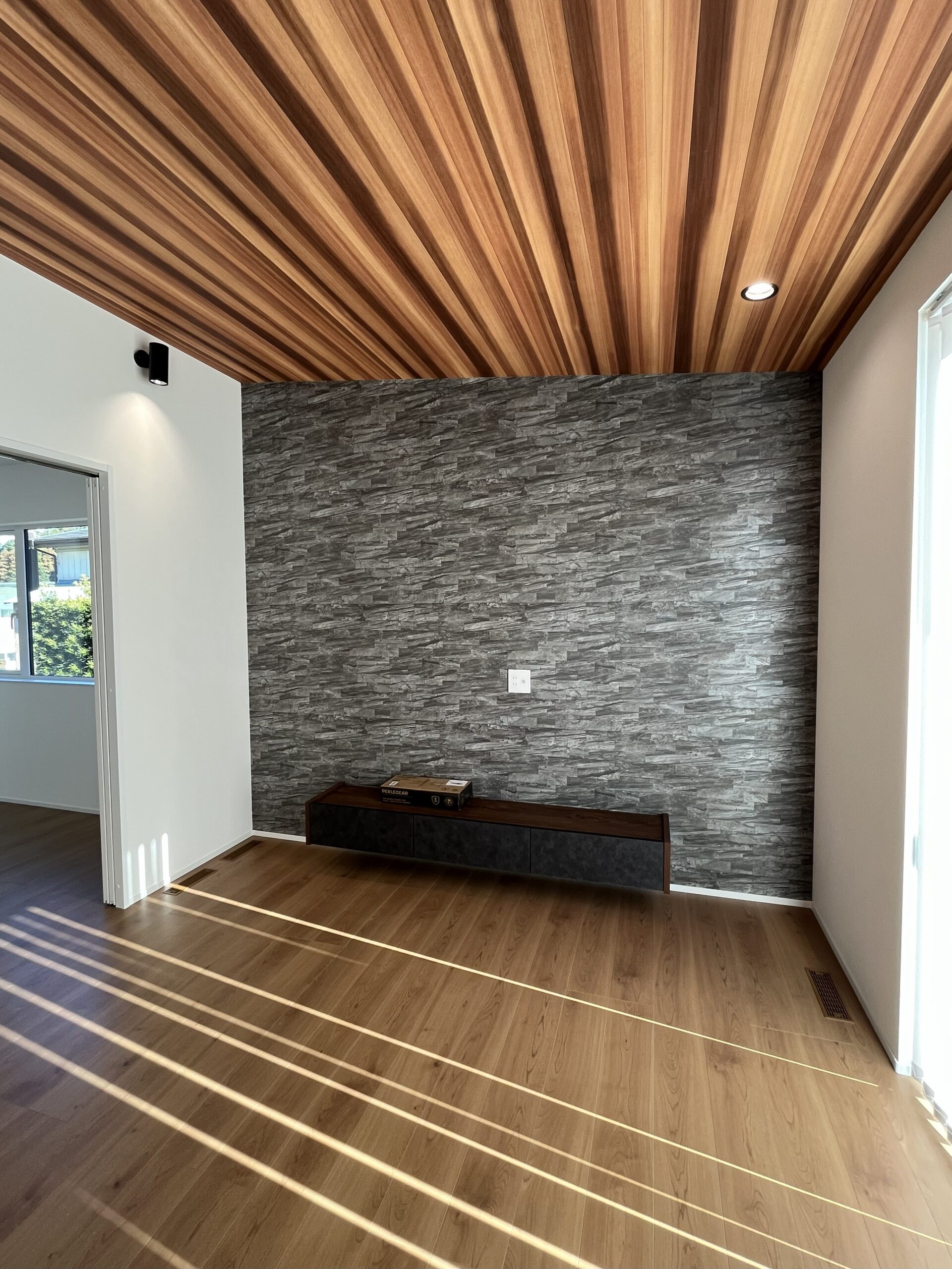 天井の木目と壁の石調が映えるリビング。自然素材の温もりを感じる、心地よいひととき。