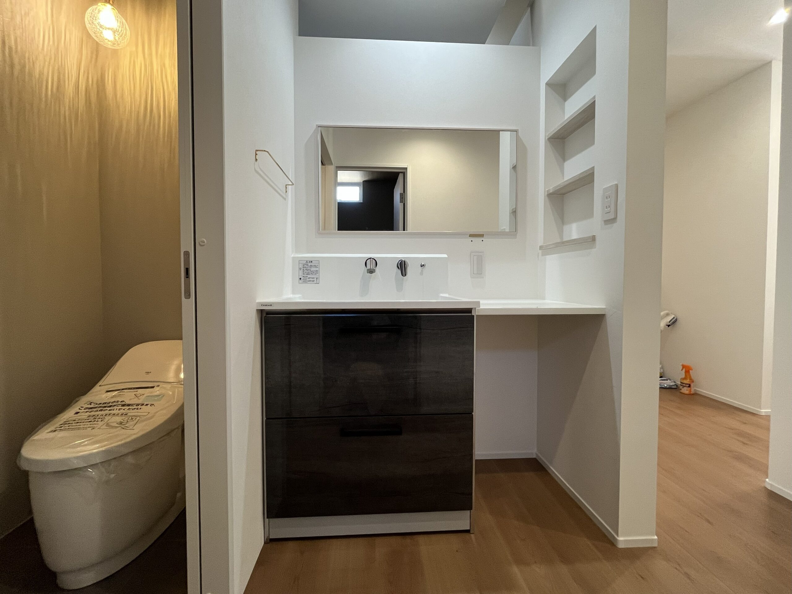 洗面とトイレを近接配置し、朝の支度もスムーズに。シックな色調で落ち着きある空間に。