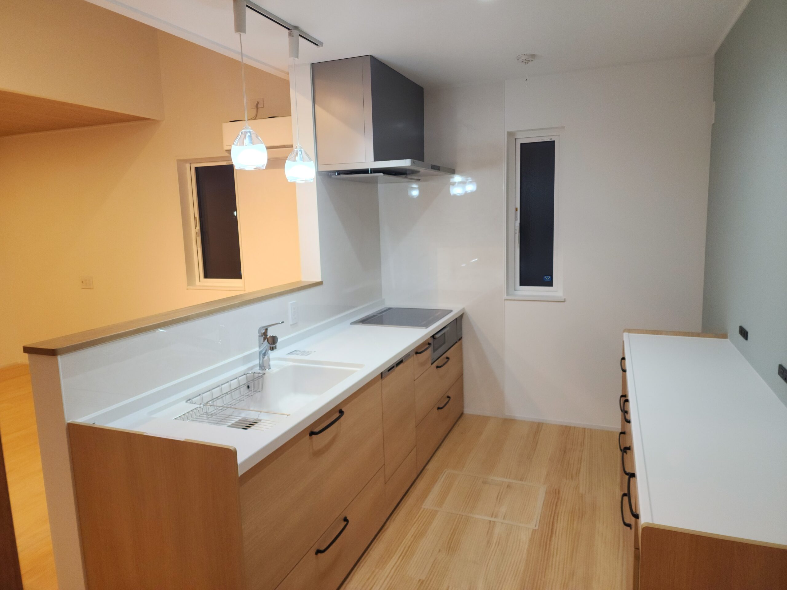 木目調の扉と白い天板が調和するキッチン。背面収納を備え、すっきりとした空間で家事のしやすさを叶えました。
