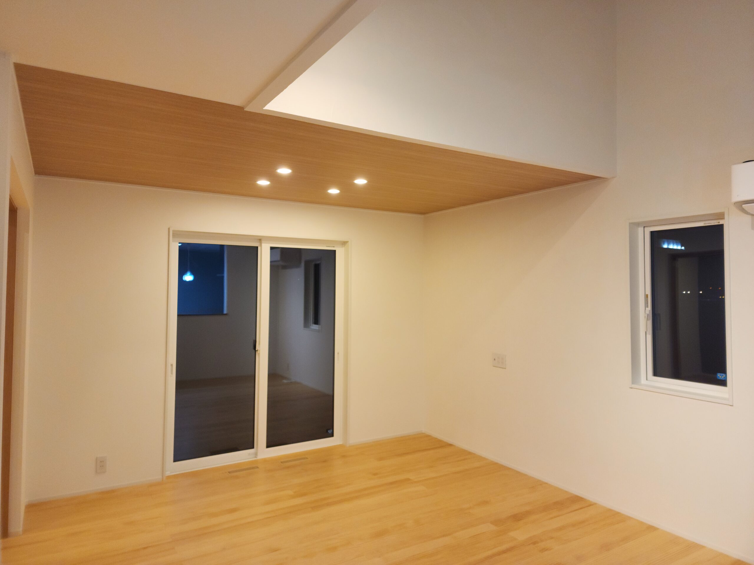 折り上げ天井とダウンライトが演出する、開放感のあるリビング。木目の温もりが広がり、家族が心地よく集える空間になりました。