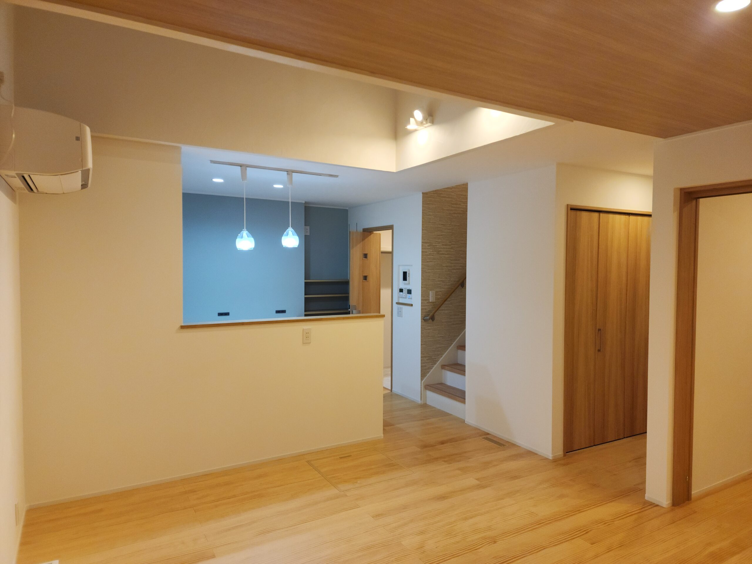 天井の木目やフローリングの優しい色合いが、シンプルな空間に温もりを添えています。飽きのこないナチュラルテイストのインテリアは、家具やインテリア小物も合わせやすく、住まい手のライフスタイルに柔軟に寄り添ってくれます。明るさと落ち着きのバランスがとれた内装は、毎日の暮らしにちょうどよい安らぎを与えます。