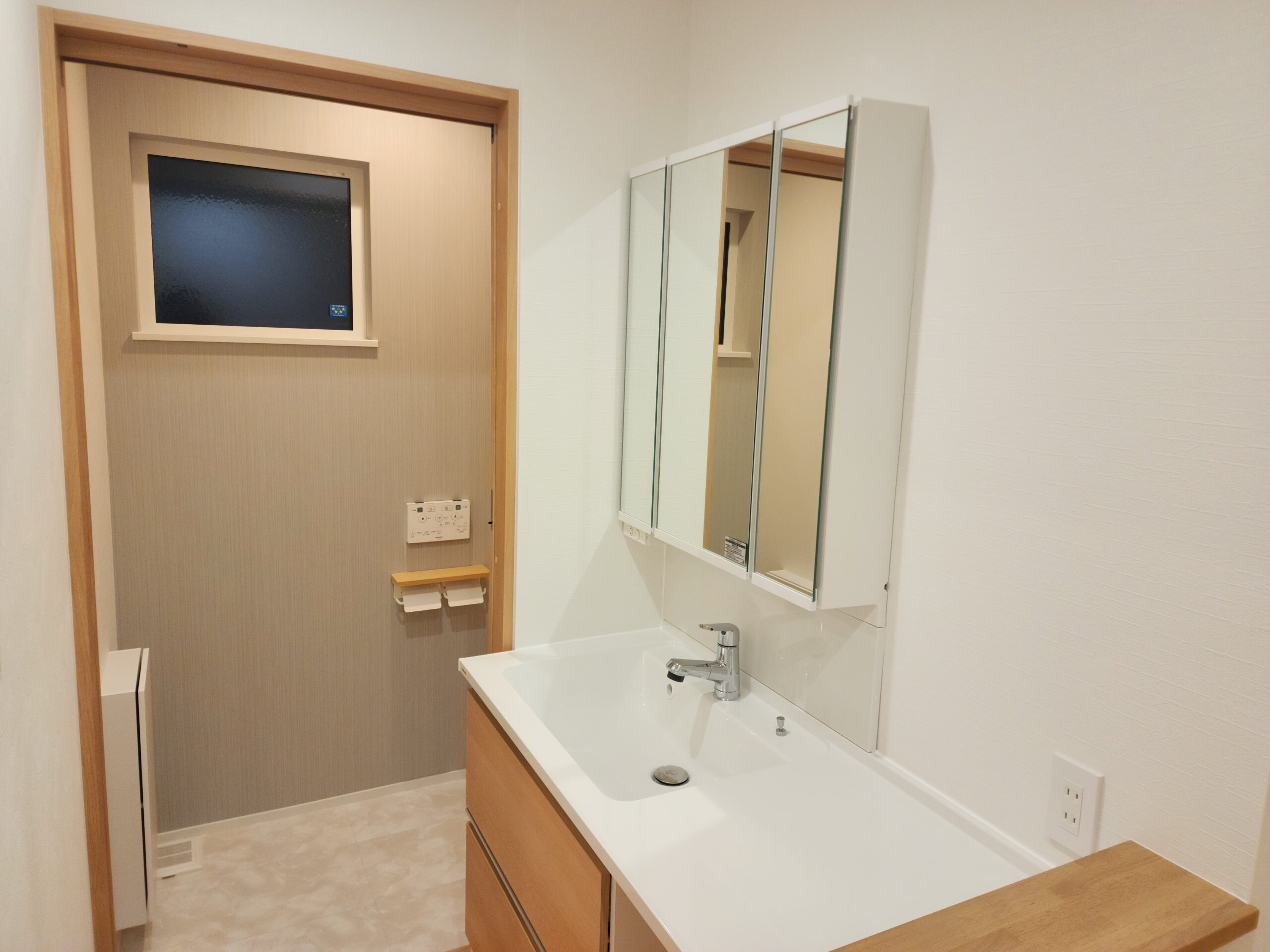 木目の扉とシンプルな洗面台を組み合わせた清潔感ある空間。収納力のある三面鏡で、毎日の身支度を快適にサポートします。