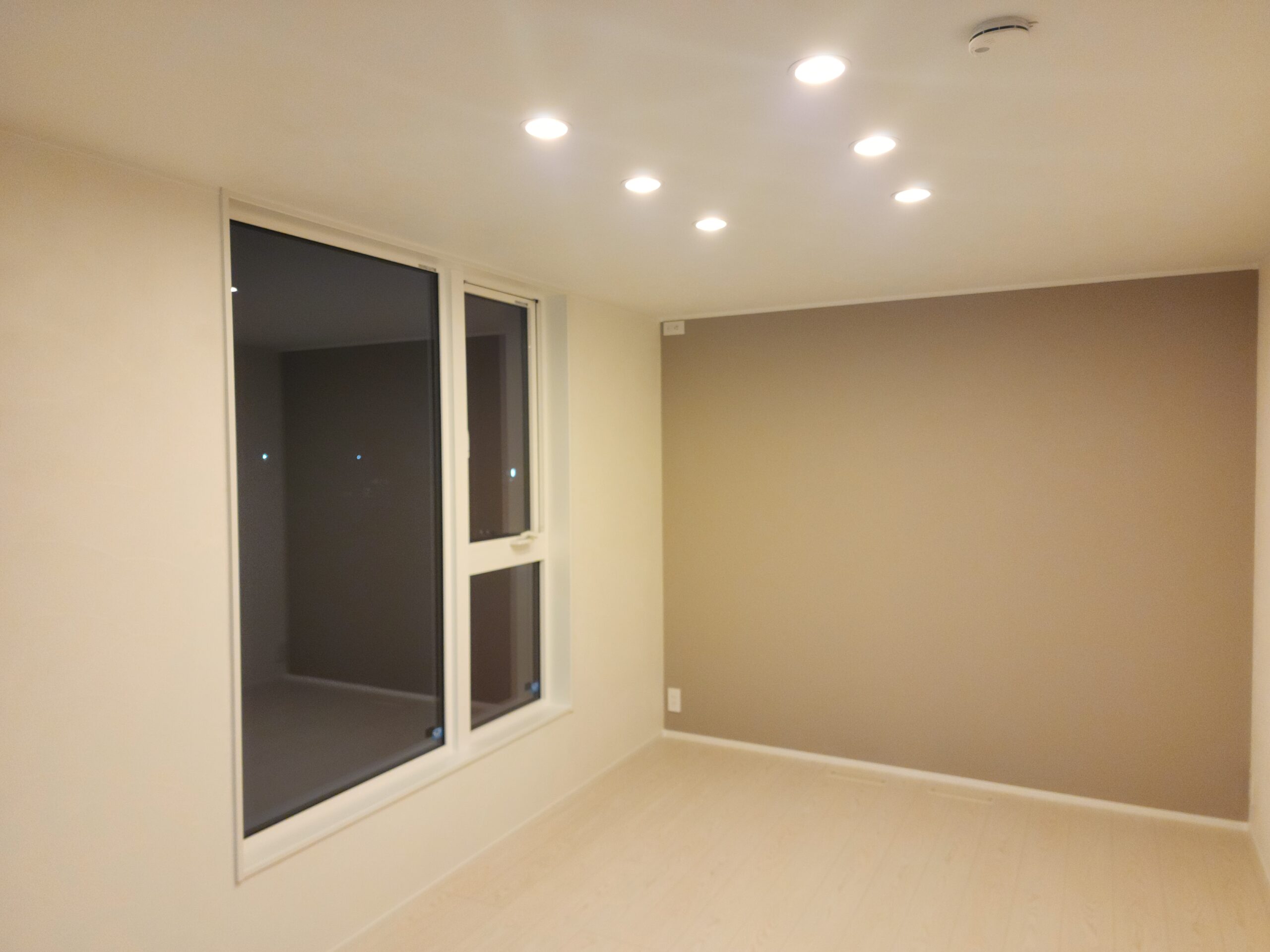 やわらかな色合いのアクセントクロスが印象的な洋室。窓から光が差し込み、シンプルで落ち着いた空間は寝室やプライベートルームに最適です。