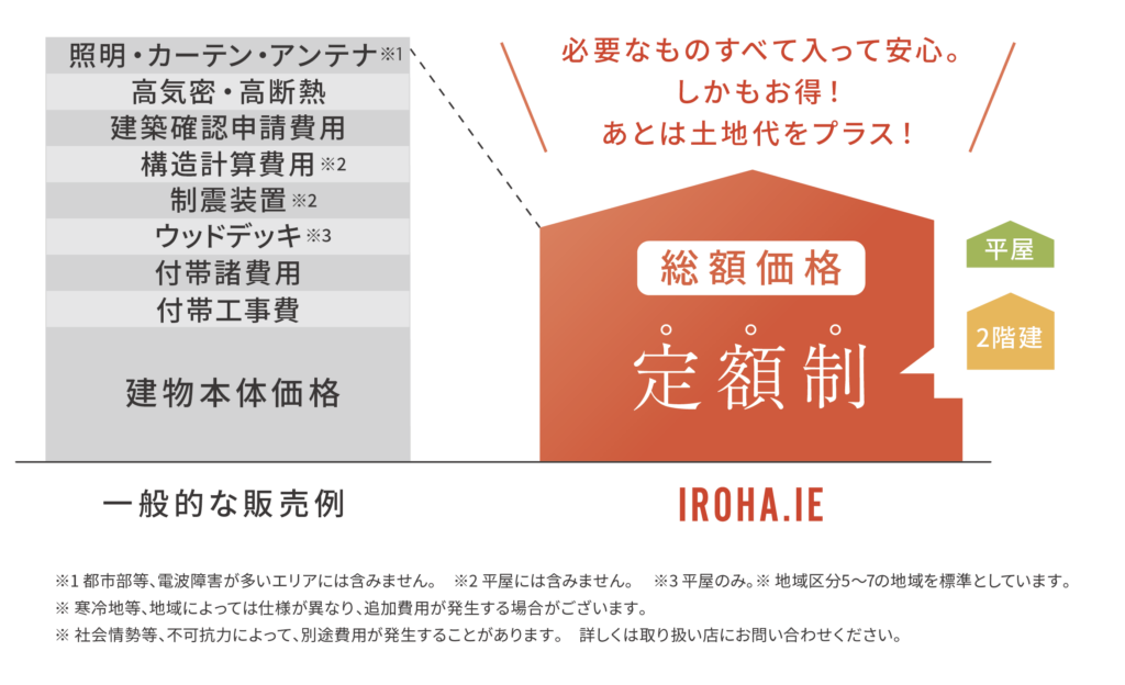 建物本体・付帯工事・各種保証・諸経費までを含めた定額制。